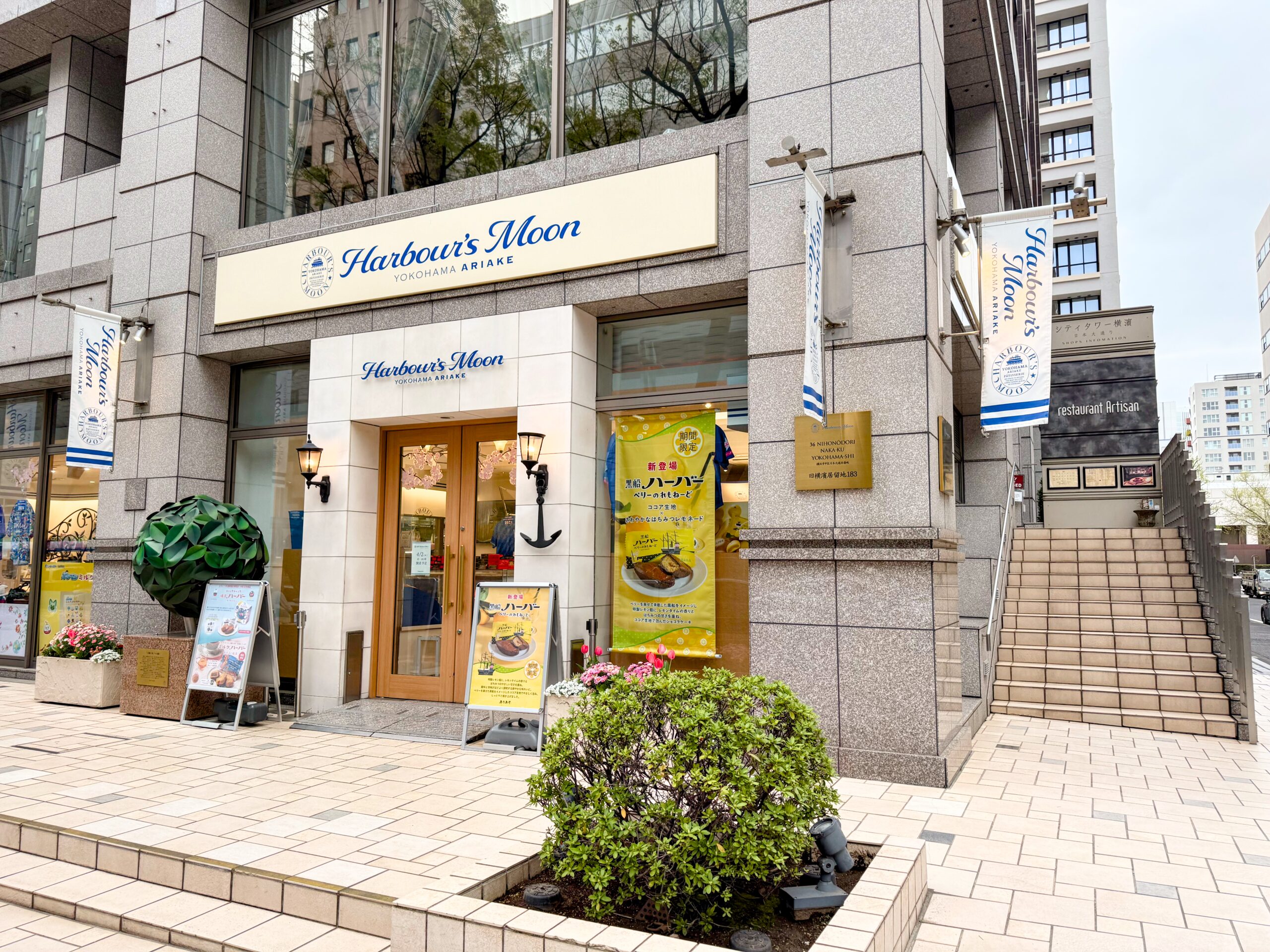 崎陽軒のシウマイと並ぶ横浜土産の定番、「ありあけのハーバー」が展開する「ハーバーズムーン」本店前の壁面には、