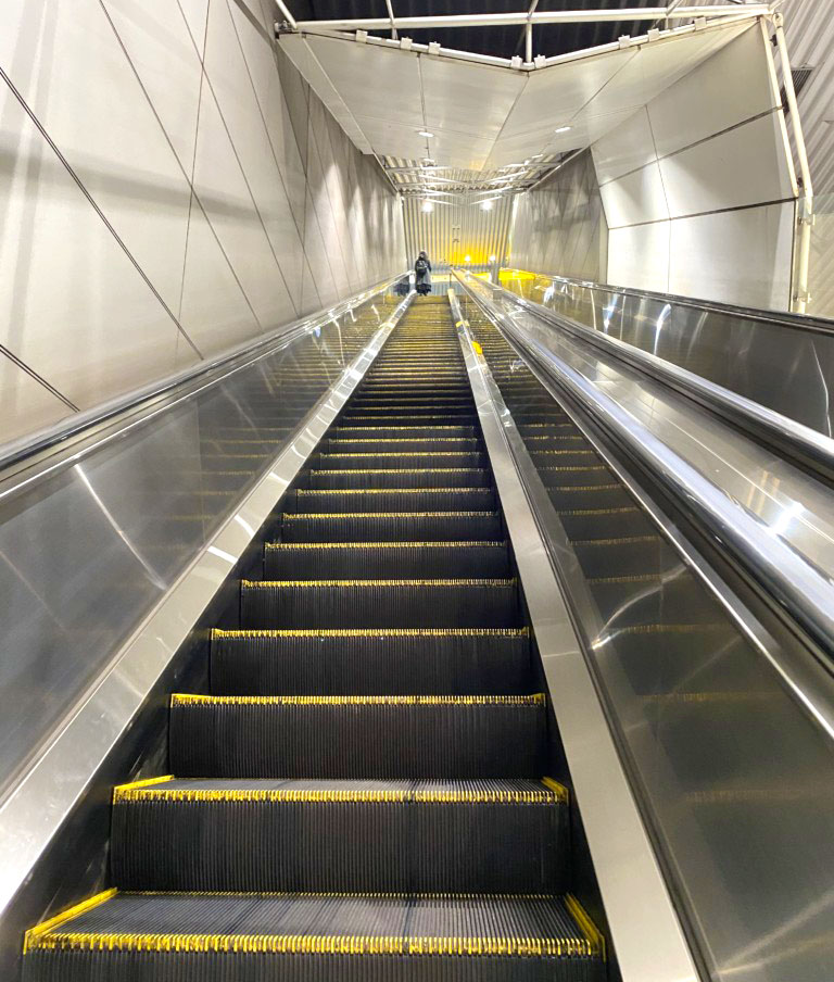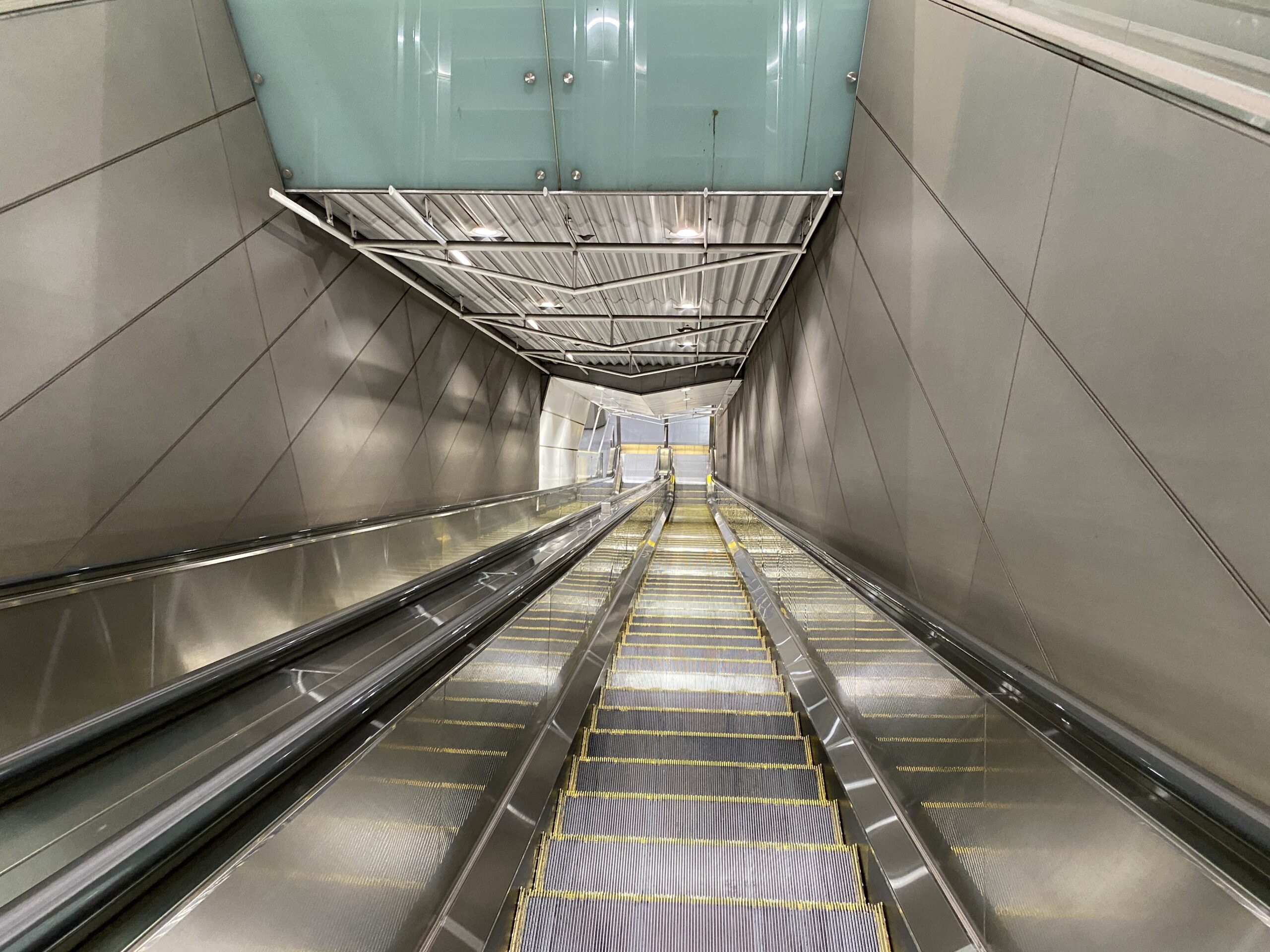 ホーム階(地下5階)から改札階(地下2階)までを一気に上るエスカレーターもまた、駅の個性の一つになっていますが、ここでもホーム階同様、一切の無駄が省かれています。