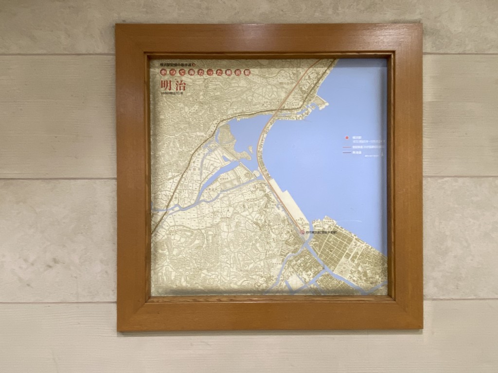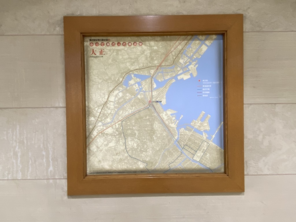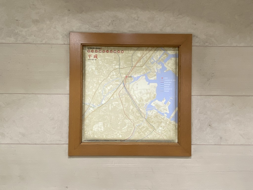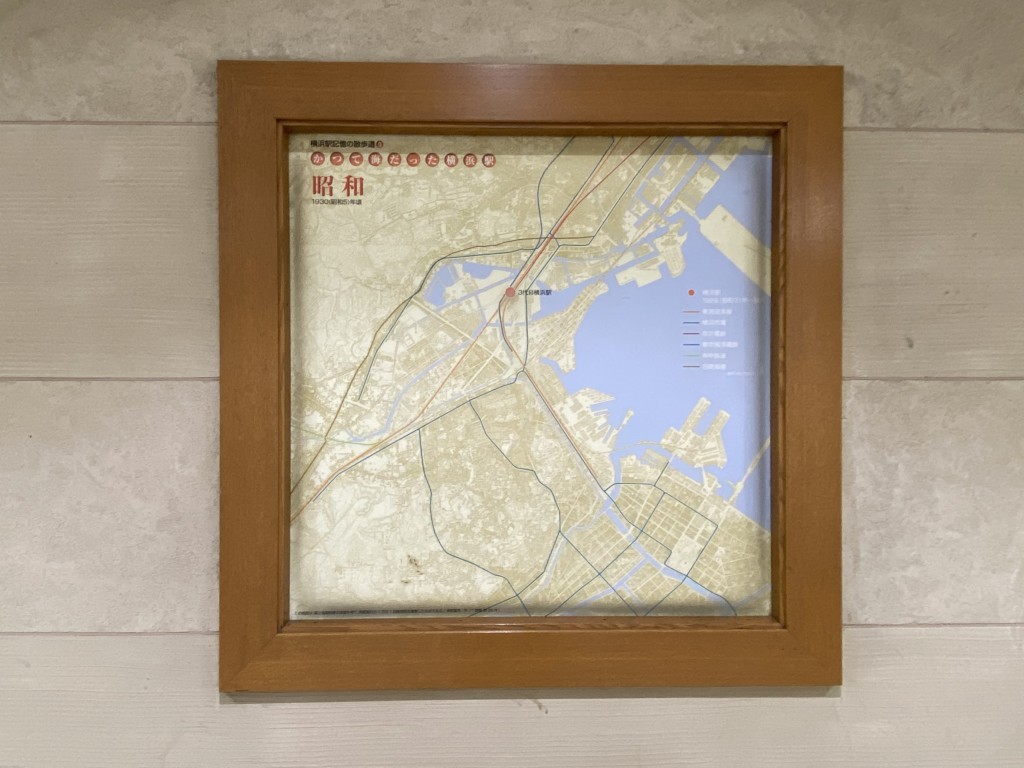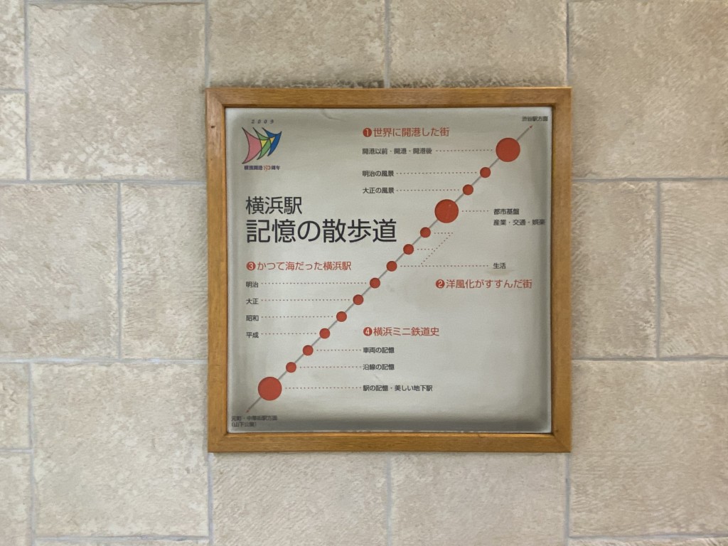 みなとみらい線・横浜駅の南改札付近(JRほかの横浜駅・中央口付近)から横浜駅みなみ口方面へ伸びた「南北連絡通路」の南側にはロッカーが用意されている他、壁面に横浜の歴史が概観できる資料が色々はめ込まれています。