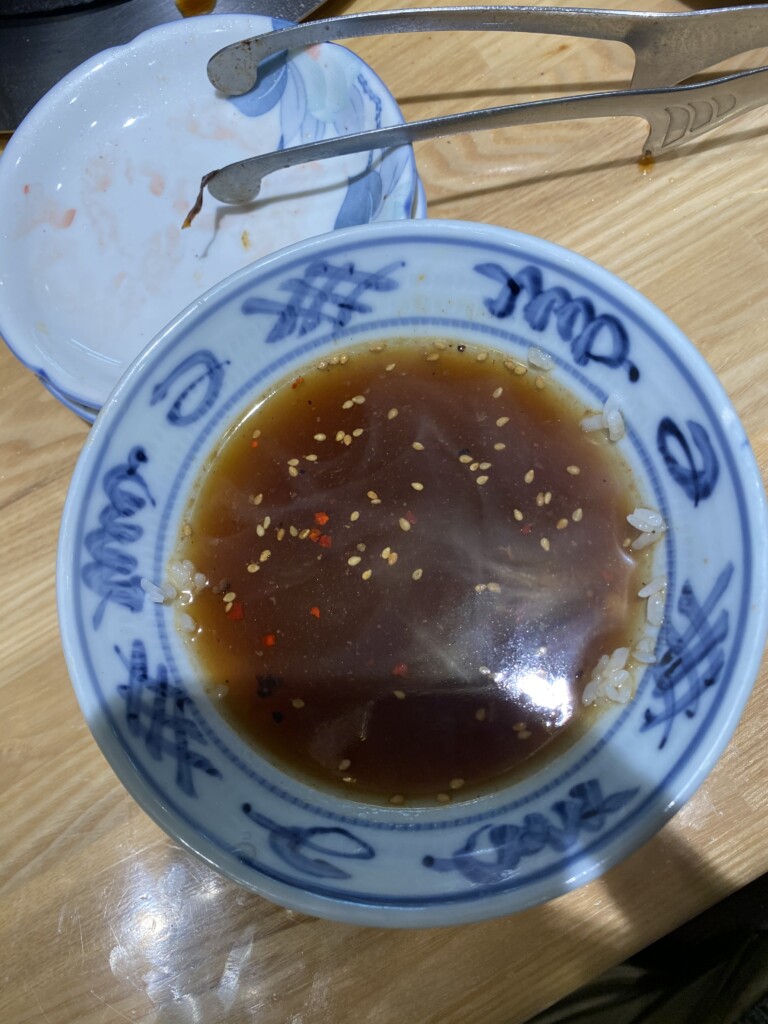 “締め”には食後に残ったタレを茶碗に入れてお茶を注いでもらい、これを飲みます。