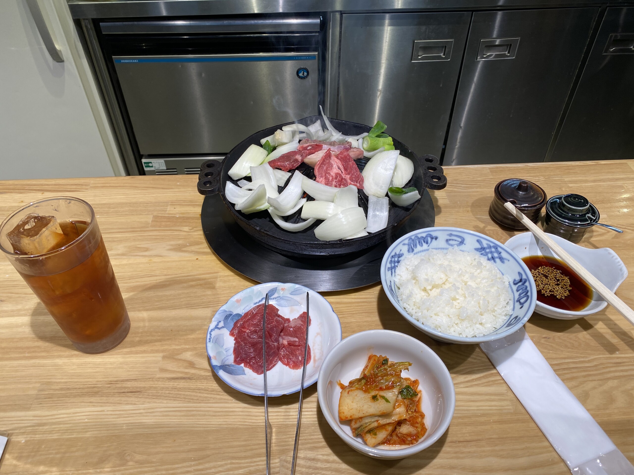 メニューを渡されて、飲み物と肉、さらにはライスとキムチを注文するのがいつもの頼み方、かつ定番に近い頼み方でもあるようですが、野菜は初回無料(追加は有料)なので、メニューを渡され肉を頼む時点で既に鉄板に乗っています。