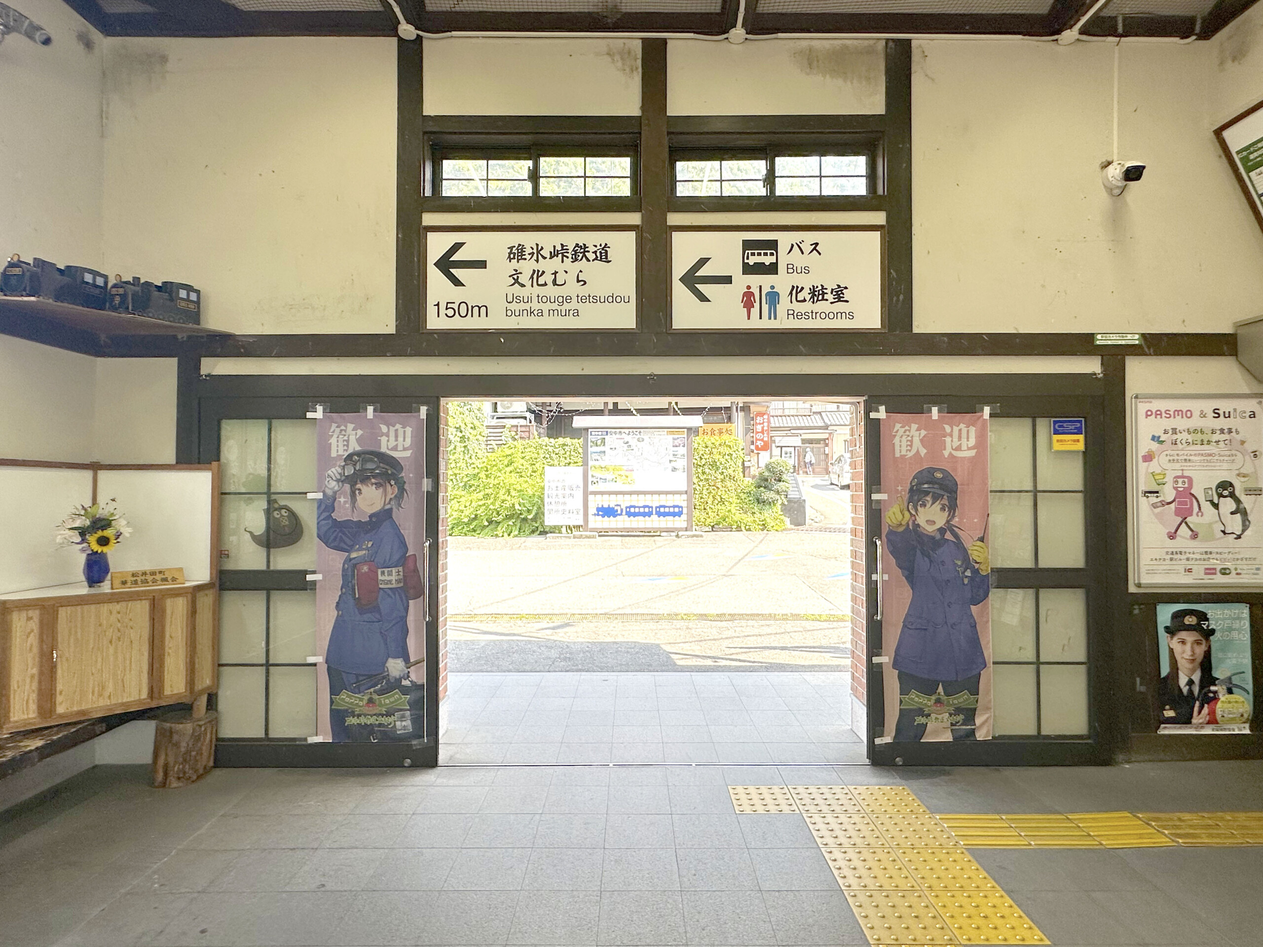 JR信越本線・横川駅の改札を抜けると、駅直近にある碓氷峠鉄道文化むらのイメージキャラクター、横川夢ちゃん(写真右、臨時職員)、結ちゃん(左、運輸課所属の機関士)の二人が出迎えてくれます。
