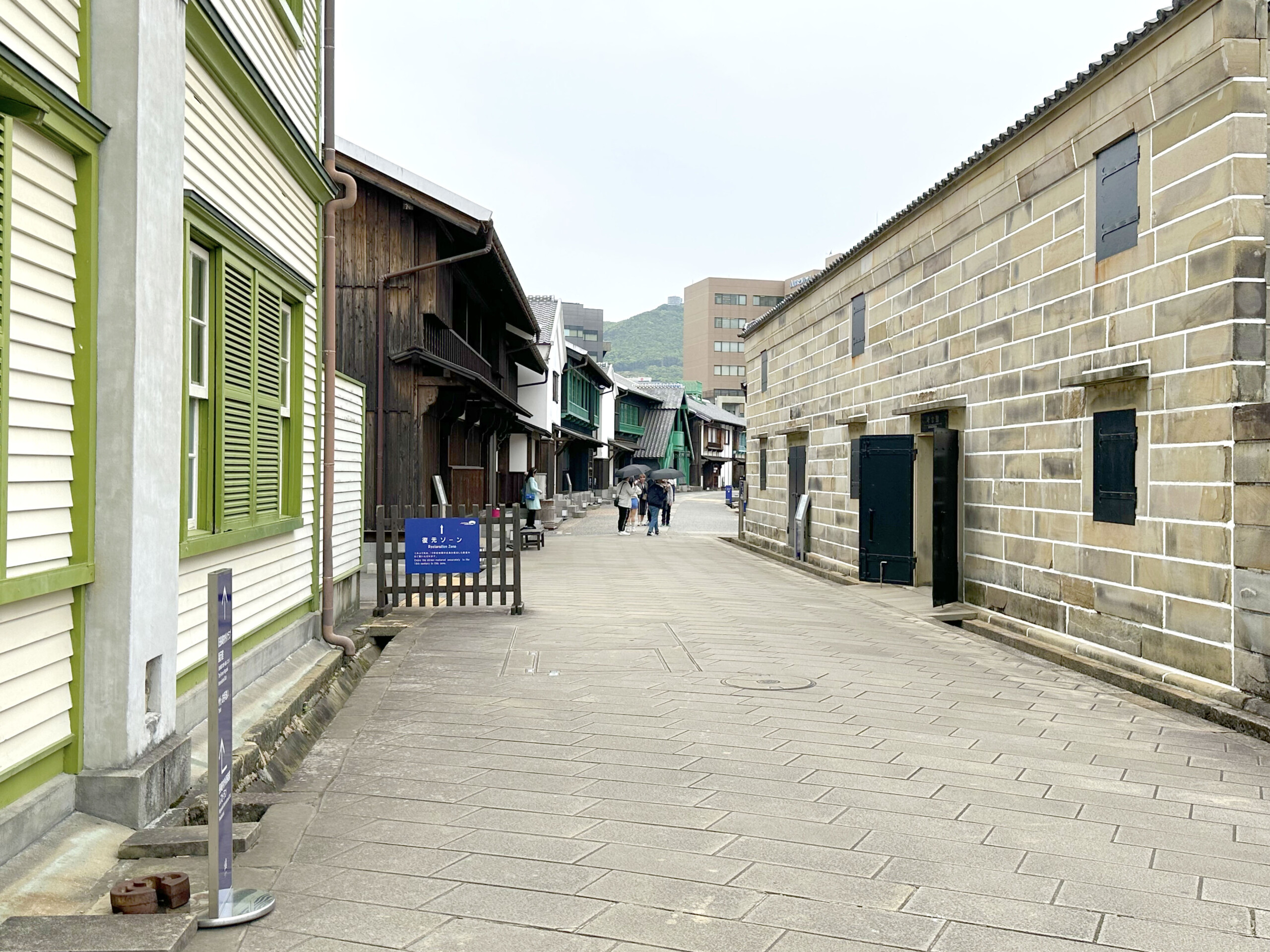 写真左手にあるのは幕末の商社で使われていた石倉で、写真右手に位置するのは乙名詰所、その前にはメインストリートが広がっています。