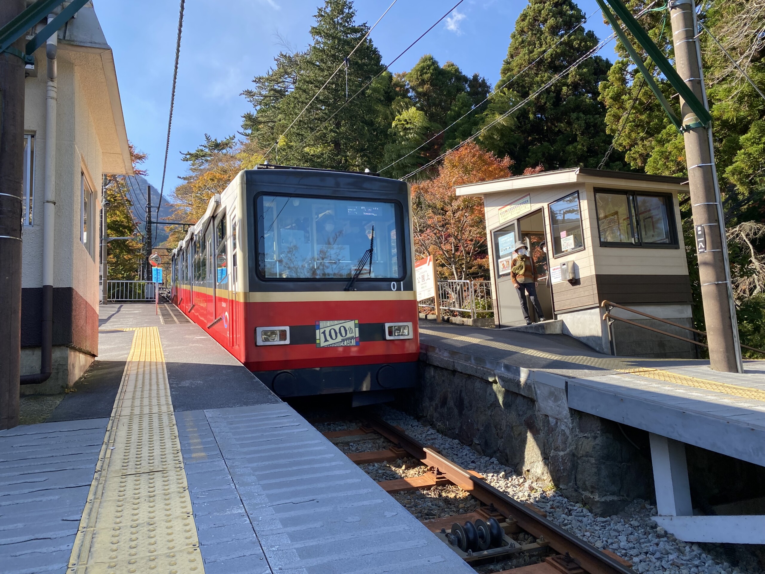 紅葉が伝える”秋の箱根”の中、勾配のきつい線路を下って行きます。