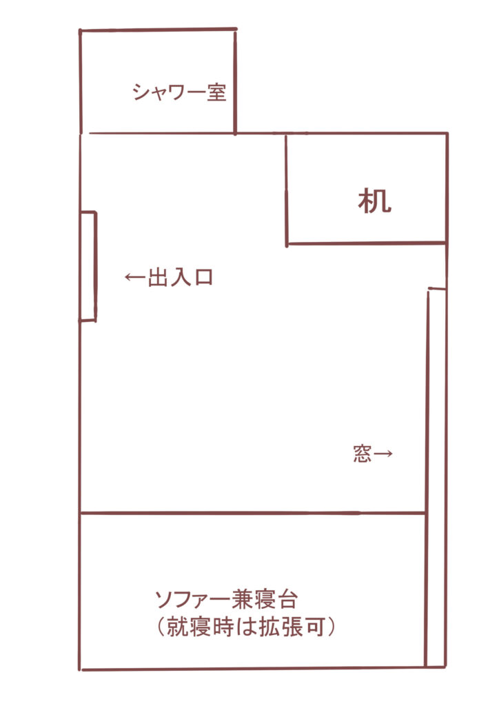 カードキーを使って部屋のドアを開けると正面の窓が視界に入って来る、左側にはシャワールームと机があって、右側には寝台に変形できるソファが用意されている、というレイアウトです。