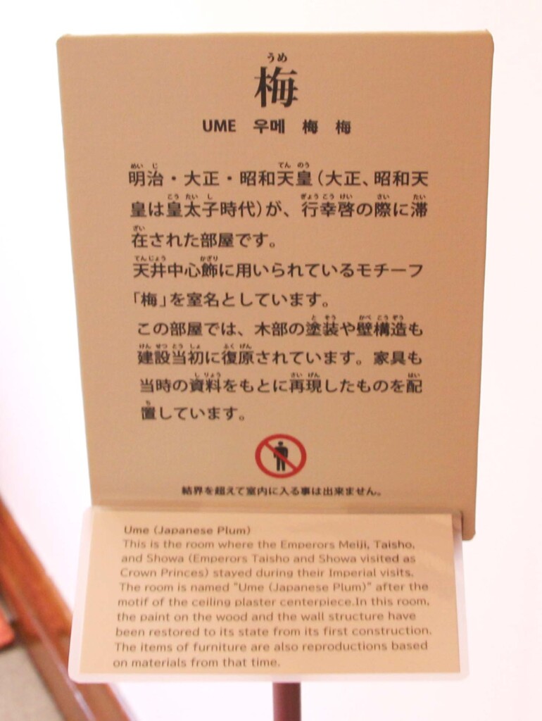 二階のまた別の一室では、かつて天皇陛下が宿泊された部屋が、宿泊された時の様子を再現して保存されています。