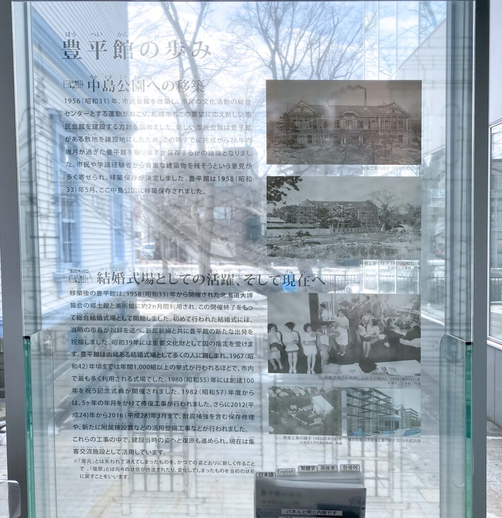 戦前はしばしば天皇陛下の行在所ともなったようですが、時計台と共に旧帝国陸軍に軍事利用された戦中、および占領軍に接収された終戦直後の混乱期を経て、昭和33(1958)年に中島公園内の現在地に移築されました。
