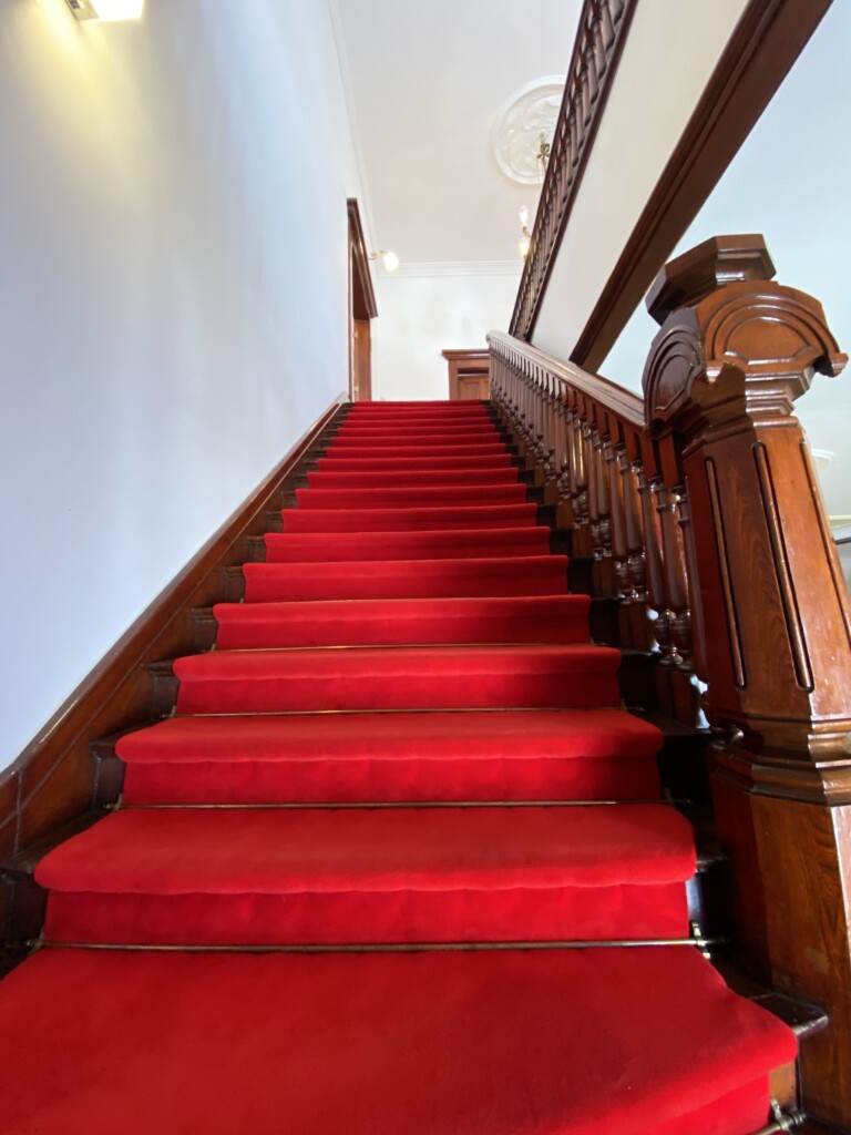 階段横や各部屋にはそれぞれ、ここも「館内の見どころ」として指摘されていたポイントである、かつてホテルだった頃の豊平館で使われていた西陣織のカーテンが再現され、かけられています。
