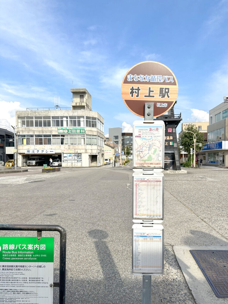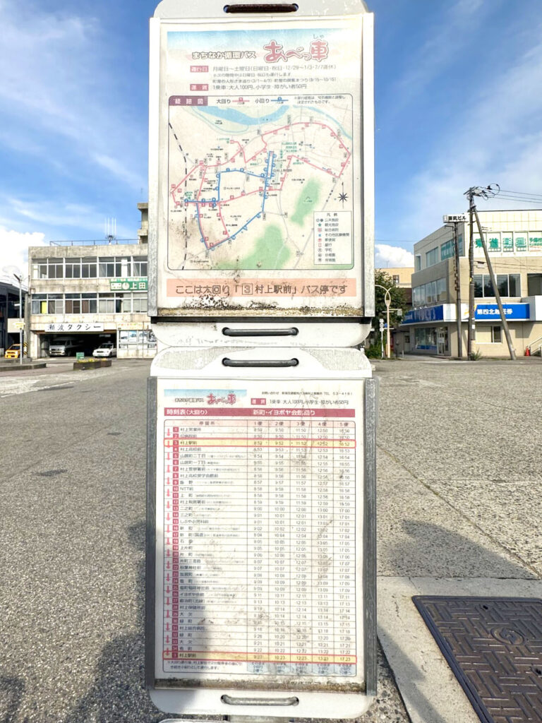 “あべっ車”と呼ばれている、まちなか巡回バスのバス停でした(村上市公式サイト “まちなか循環バス“)。