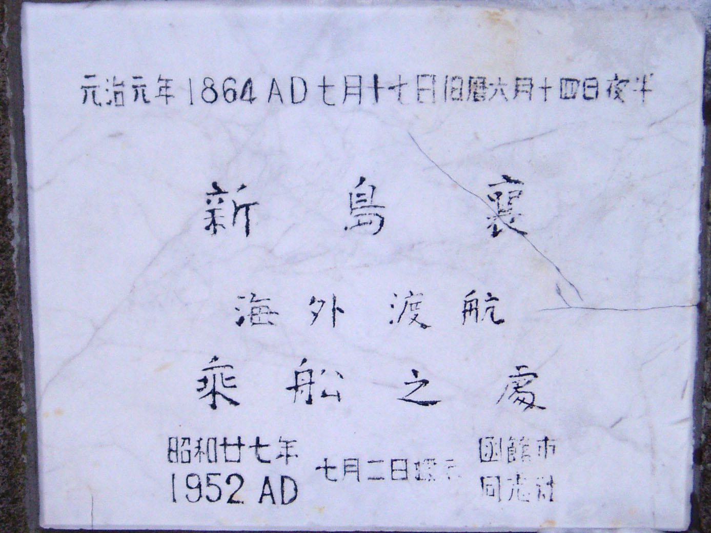 新島襄海外渡航の地函館市公式観光情報新島襄海外渡航の地碑“)は、幕府によって海外渡航が禁じられていた当時、アメリカへの密航を企てた新島襄が、アメリカへ渡航するために上海行きのアメリカ船・ベルリン号に乗船した地です。