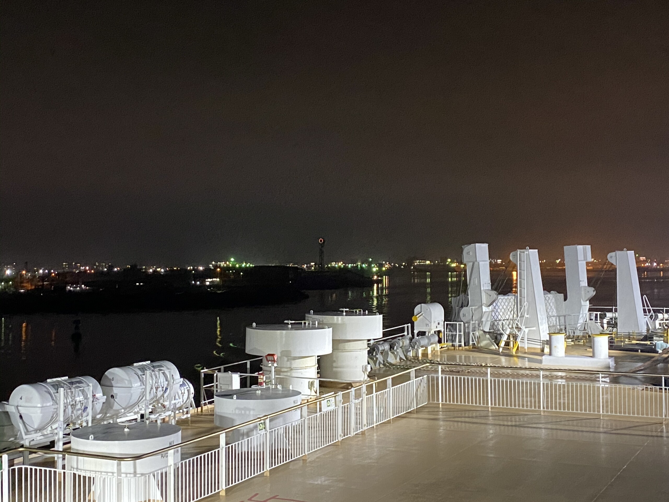 さんふらわあ号では乗船後即入浴可能になるということで、往路同様に乗船とほぼ同時に入浴を済ませたのち、大洗からの出航時同様、苫小牧港発のタイミングに合わせて展望デッキに出てみました。