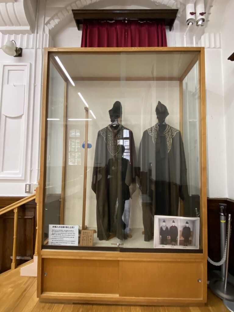 当時の弁護人が着用していた法服の展示や、