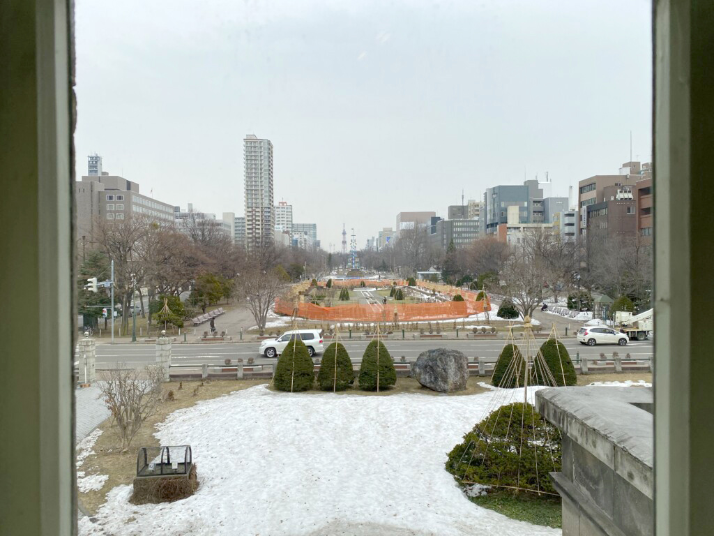 旧・札幌控訴院の窓外には、冬の終わりの札幌、大通公園が望めます。
