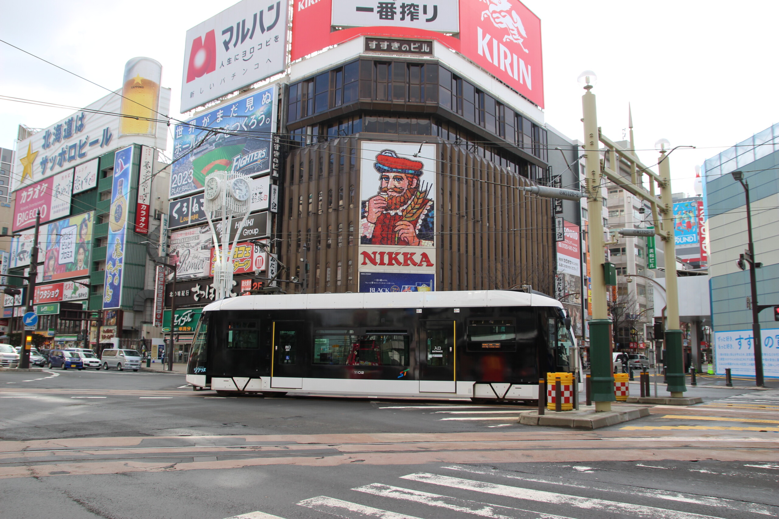 すすきの駅傍の交差点前を通過後、市電は札幌駅方面へ向かって走り、大通公園の手前で左折します。