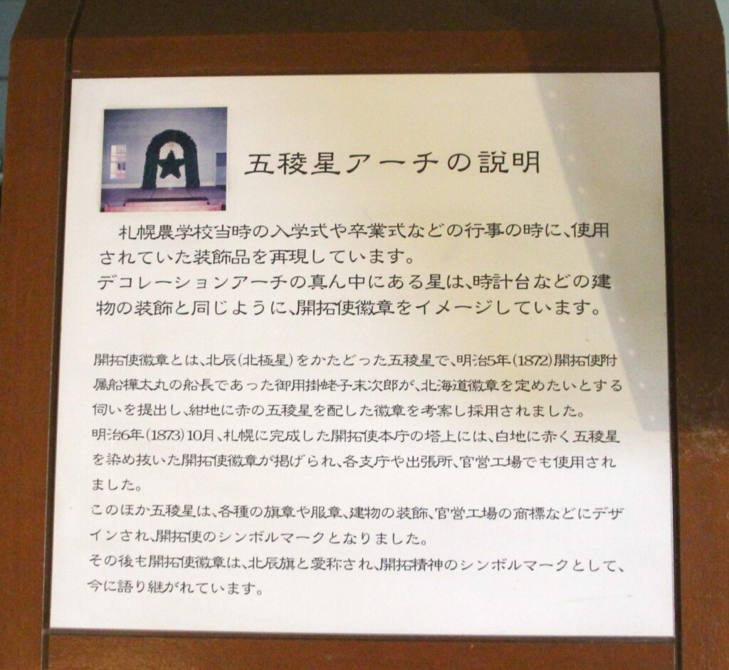 二階では、時計台にもついている星のマーク=五稜星についての説明もなされていますが、五稜星はかつての開拓使のシンボルで、サッポロビールの星のマークと全く同じ由来がある他、道庁の旧本庁舎や中島公園の豊平館でも使用されています。