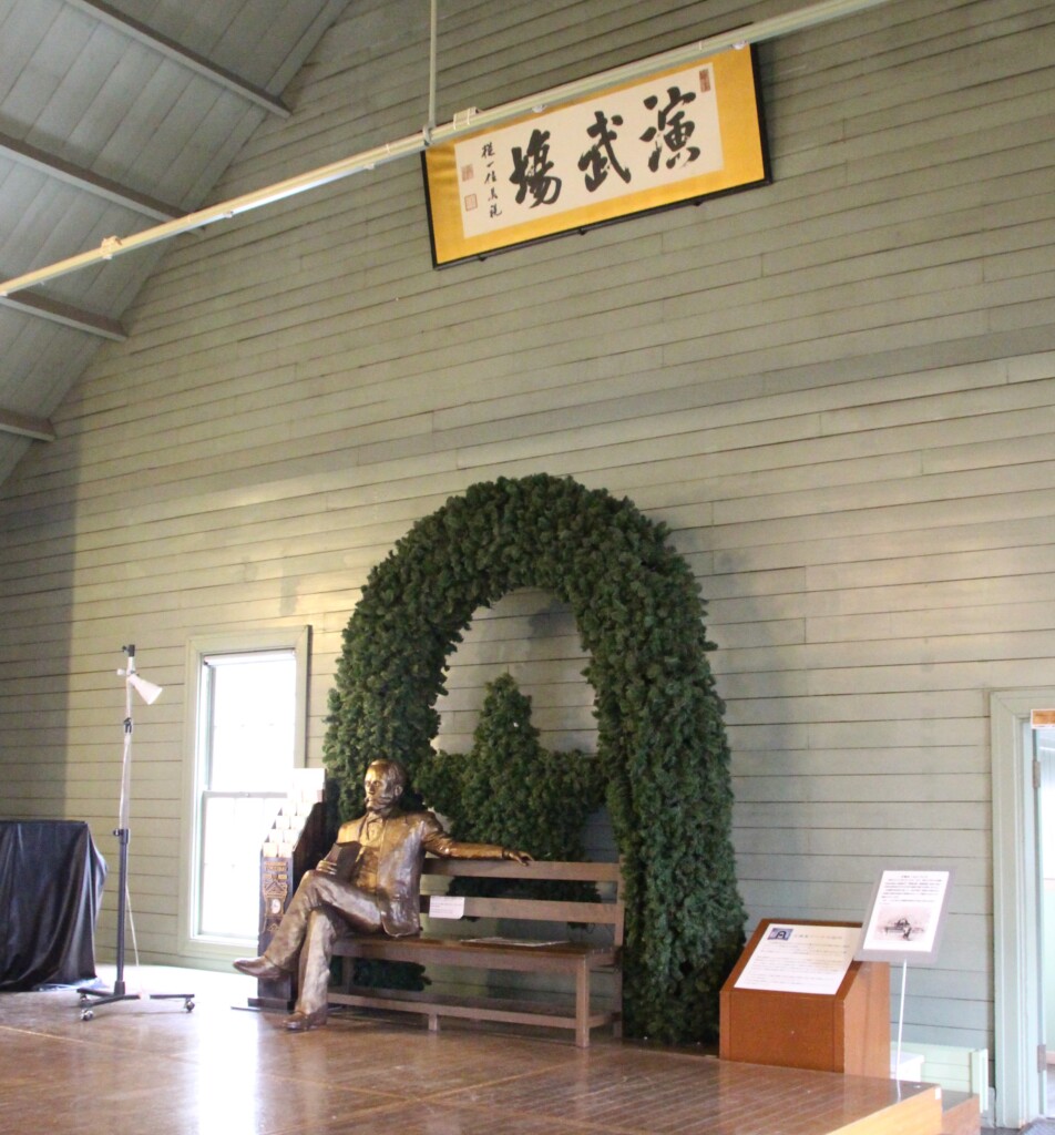 壇上のベンチには、札幌農学校初代教頭のウィリアム・スミス・クラーク博士が座っていて、
