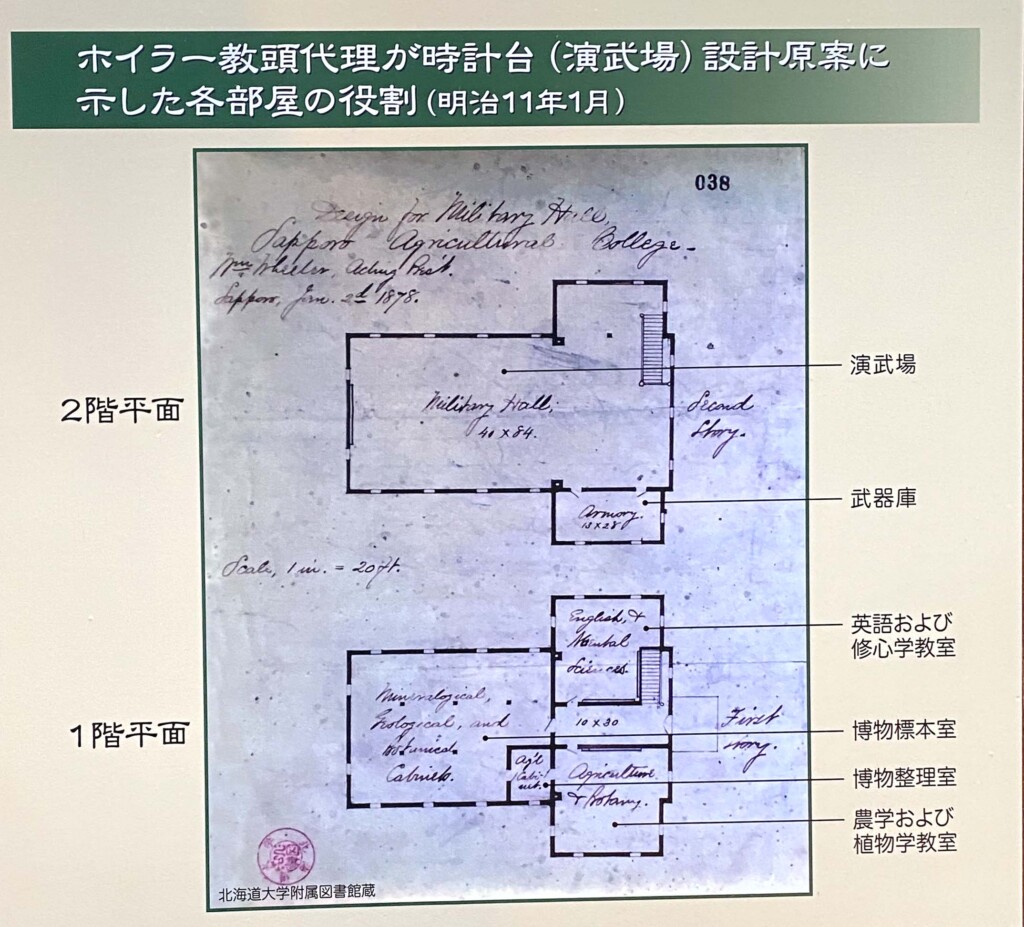 かつての時計台が札幌農学校の施設として設計された時の原案も展示されていますが、