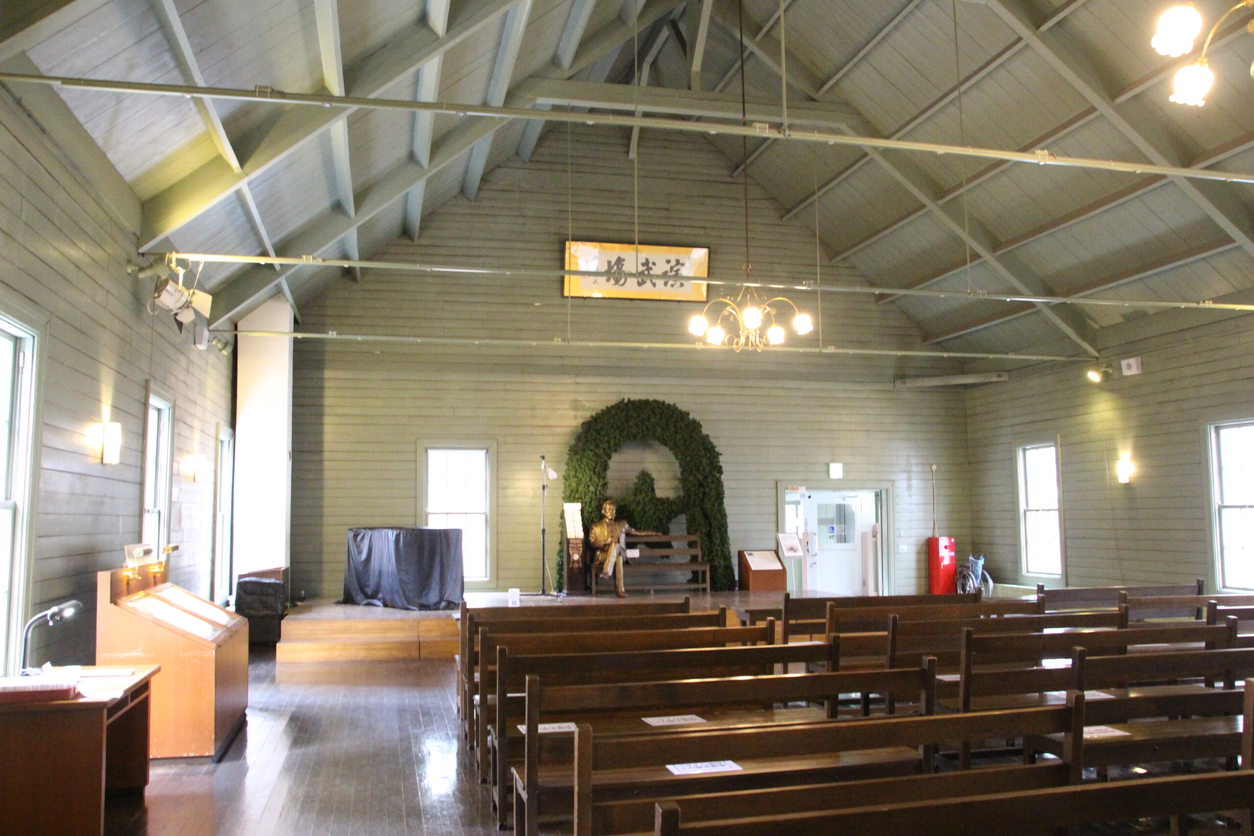 ホールとなっている二階では、かつての講堂の様子が再現されていますが、