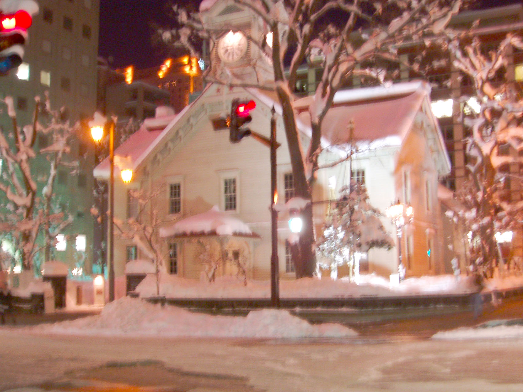 雪の季節の、夜の時計台です。